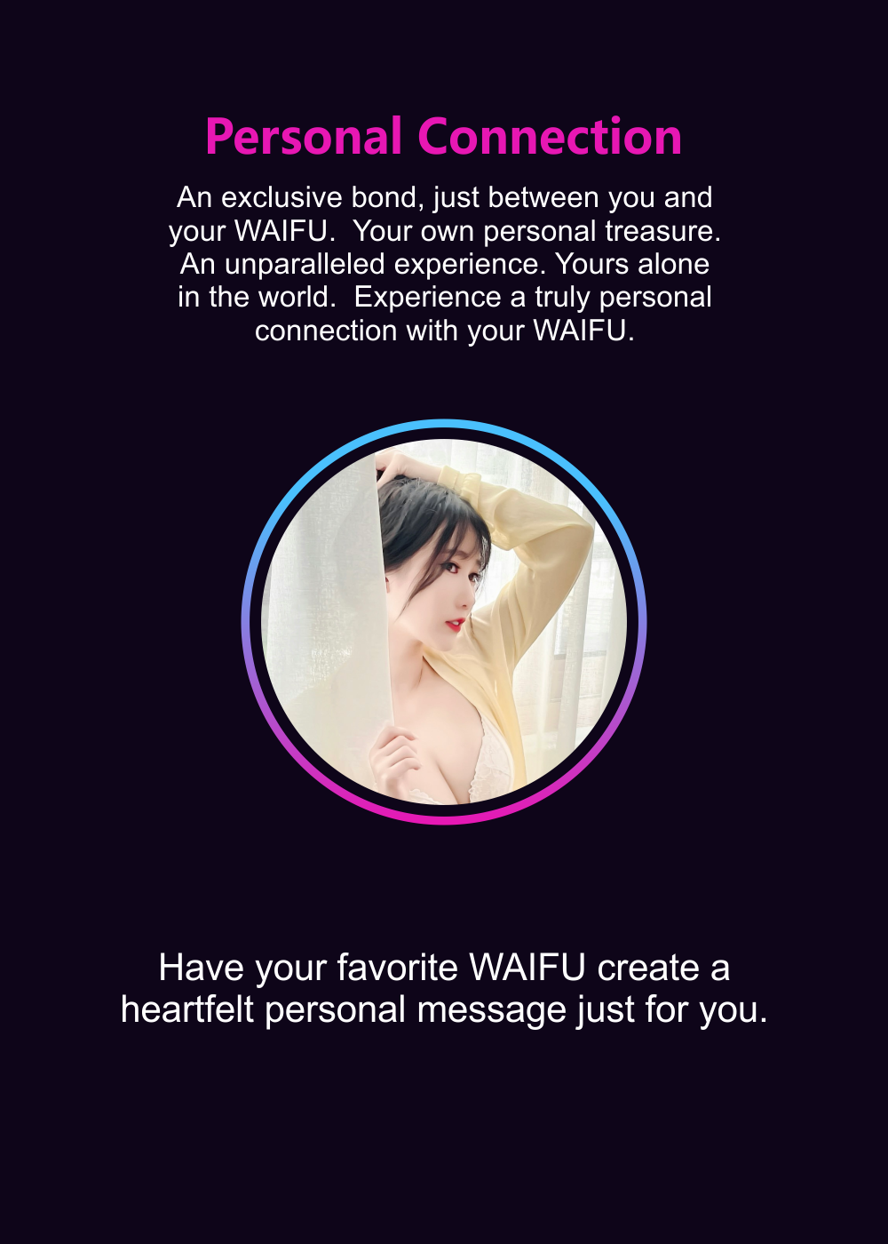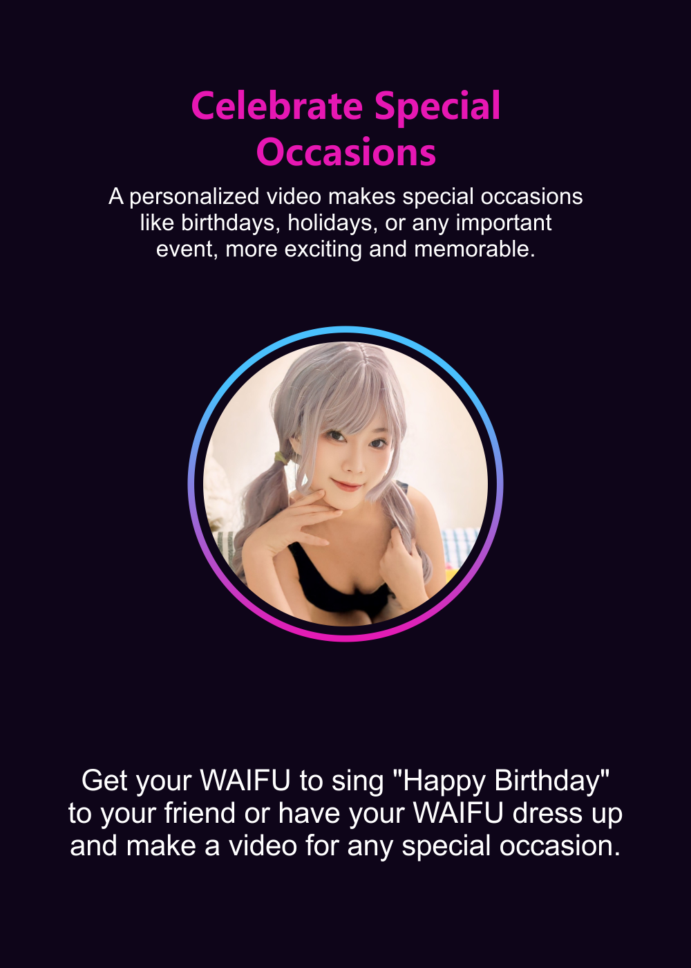 Find the right Waifu for any occasion: Birthdays, milestones, or even a well-deserved treat for yourself. Find your perfect Waifu and make a request for what you want.