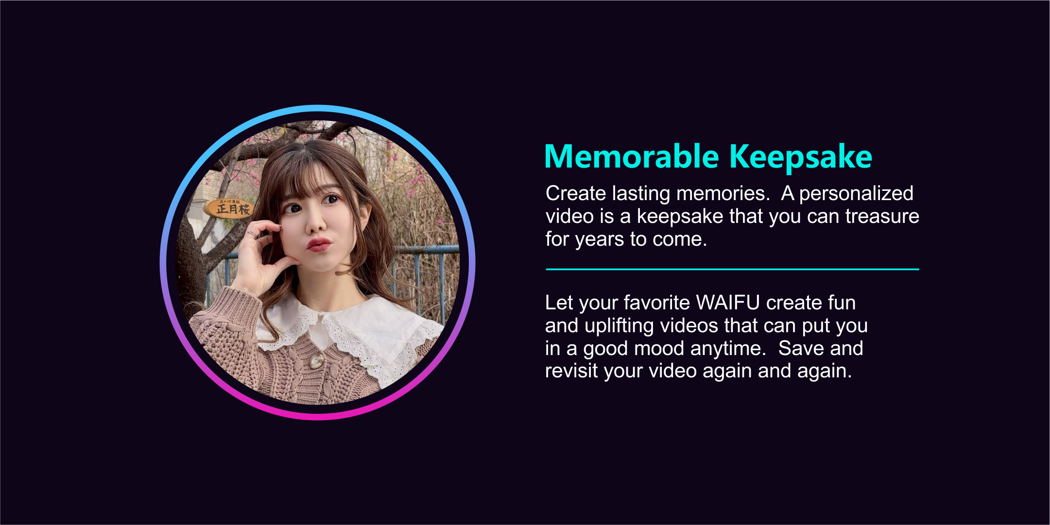 You can have special requests from having your Waifu create a video for your businesses or products, or to do video calls and join virtual events, or even have them join your offline / onsite events from large business settings to intimiate 1-on-1 time with you and your Waifu only.